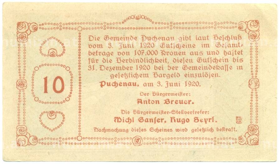 Купить 10 геллеров 1920 года Австрия — Пухенау (Нотгельд) по привлекательной цене можно в нашем интернет-магазине — Вам достаточно оформить заказ на сайте. Все монеты, представленные в каталоге, находятся в наличии на нашем складе.