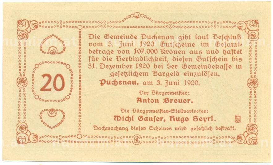 Купить 20 геллеров 1920 года Австрия — Пухенау (Нотгельд) по привлекательной цене можно в нашем интернет-магазине — Вам достаточно оформить заказ на сайте. Все монеты, представленные в каталоге, находятся в наличии на нашем складе.