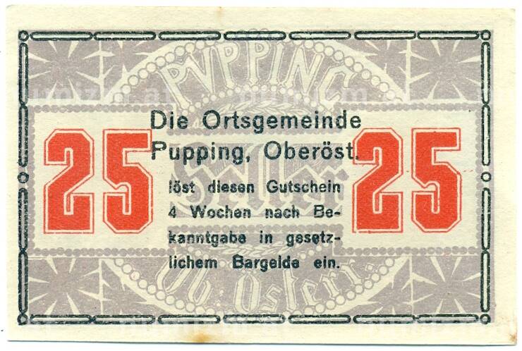 Купить 25 геллеров 1920 года Австрия — община Пуппинг (Нотгельд) по привлекательной цене можно в нашем интернет-магазине — Вам достаточно оформить заказ на сайте. Все монеты, представленные в каталоге, находятся в наличии на нашем складе.