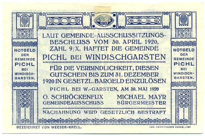 Купить 20 геллеров 1920 года Австрия — община Пихль-бай-Виндишгарстен (Нотгельд) по привлекательной цене можно в нашем интернет-магазине — Вам достаточно оформить заказ на сайте. Все монеты, представленные в каталоге, находятся в наличии на нашем складе.