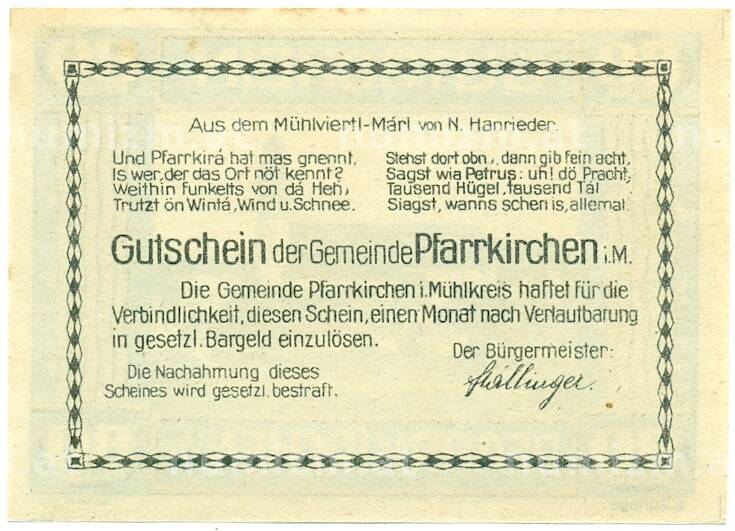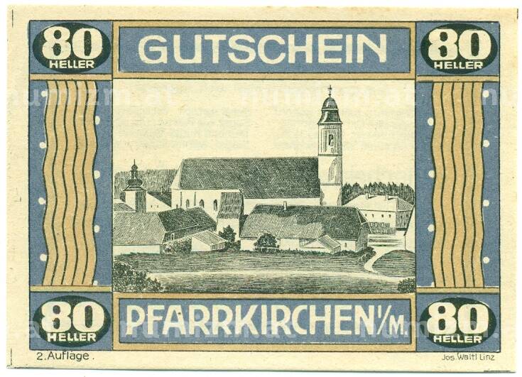 Банкнота 80 геллеров 1920 года Австрия — Пфарркирхене-на-Мондзее (Нотгельд) (Артикул: B2-16145): подробные характеристики, качественные фотографии в высоком разрешении, низкая цена.