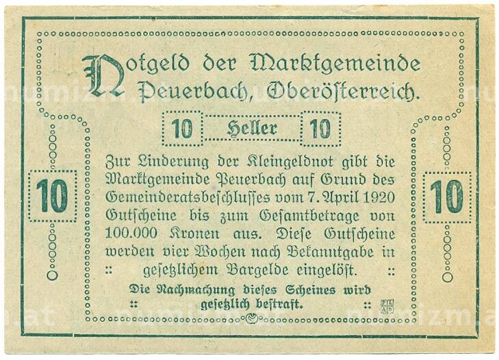 Купить 10 геллеров 1920 года Австрия — Пеуэрбах (Нотгельд) по привлекательной цене можно в нашем интернет-магазине — Вам достаточно оформить заказ на сайте. Все монеты, представленные в каталоге, находятся в наличии на нашем складе.
