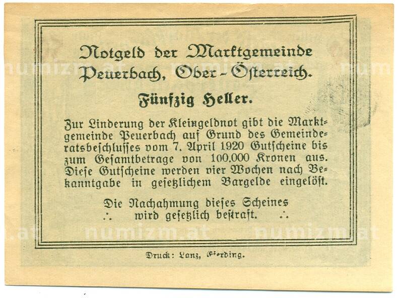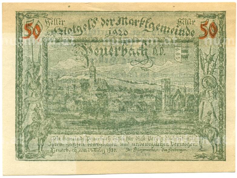 Банкнота 50 геллеров 1920 года Австрия — Пеуэрбах (Нотгельд) (Артикул: B2-16151): подробные характеристики, качественные фотографии в высоком разрешении, низкая цена.