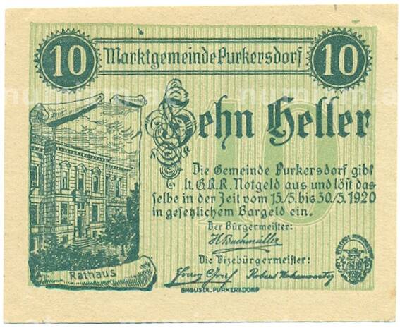 Купить 10 геллеров 1920 года Австрия — Пуркерсдорф (Нотгельд) по привлекательной цене можно в нашем интернет-магазине — Вам достаточно оформить заказ на сайте. Все монеты, представленные в каталоге, находятся в наличии на нашем складе.