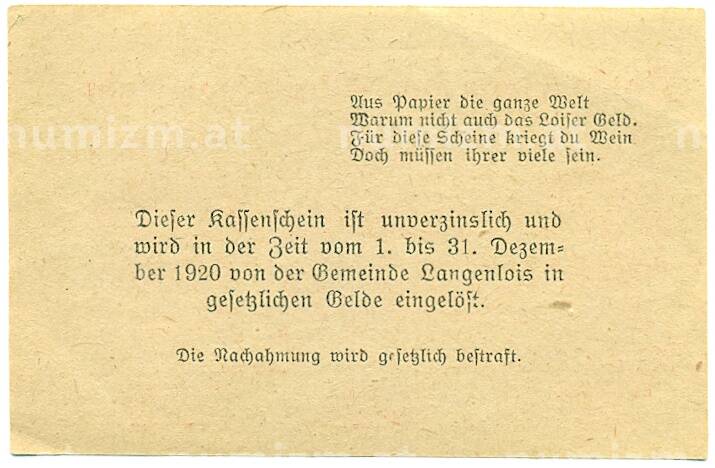 Купить 10 геллеров 1920 года Австрия — Лангенлойс (Нотгельд) по привлекательной цене можно в нашем интернет-магазине — Вам достаточно оформить заказ на сайте. Все монеты, представленные в каталоге, находятся в наличии на нашем складе.