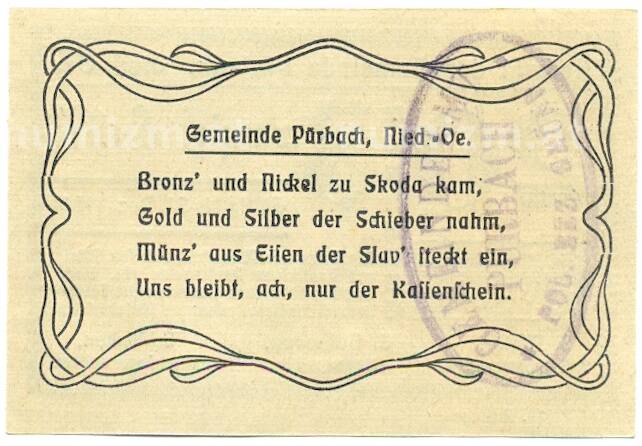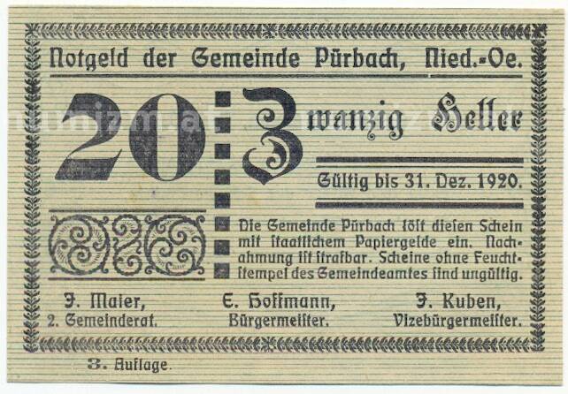 Купить 20 геллеров 1920 года Австрия — Пюрбах (Нотгельд) по привлекательной цене можно в нашем интернет-магазине — Вам достаточно оформить заказ на сайте. Все монеты, представленные в каталоге, находятся в наличии на нашем складе.
