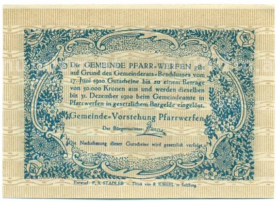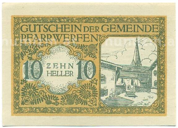 Купить 10 геллеров 1920 года Австрия — Пфаррверфен (Нотгельд) по привлекательной цене можно в нашем интернет-магазине — Вам достаточно оформить заказ на сайте. Все монеты, представленные в каталоге, находятся в наличии на нашем складе.
