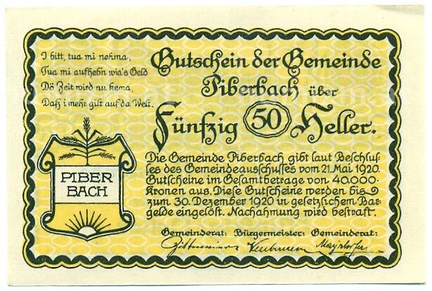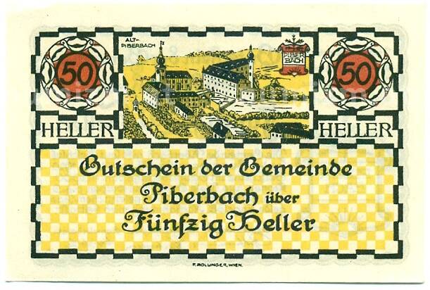 Банкнота 50 геллеров 1920 года Австрия — Пибербах (Нотгельд) (Артикул: B2-16203): подробные характеристики, качественные фотографии в высоком разрешении, низкая цена.