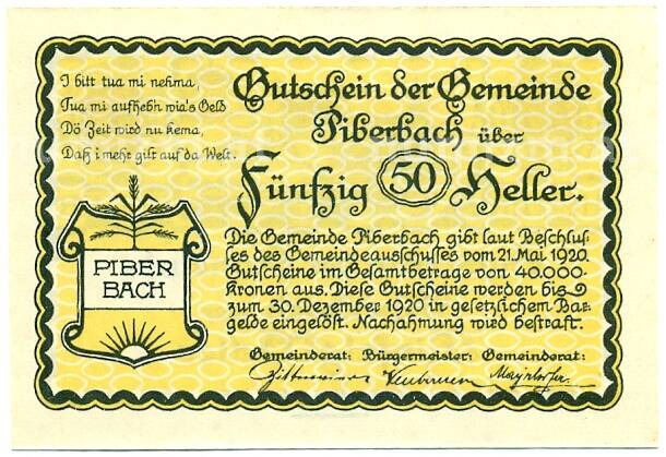 Купить 50 геллеров 1920 года Австрия — Пибербах (Нотгельд) по привлекательной цене можно в нашем интернет-магазине — Вам достаточно оформить заказ на сайте. Все монеты, представленные в каталоге, находятся в наличии на нашем складе.