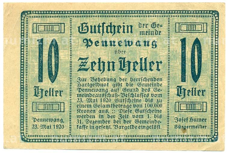 Купить 10 геллеров 1920 года Австрия — Пенневанг (Нотгельд) по привлекательной цене можно в нашем интернет-магазине — Вам достаточно оформить заказ на сайте. Все монеты, представленные в каталоге, находятся в наличии на нашем складе.