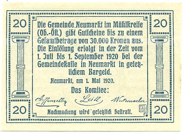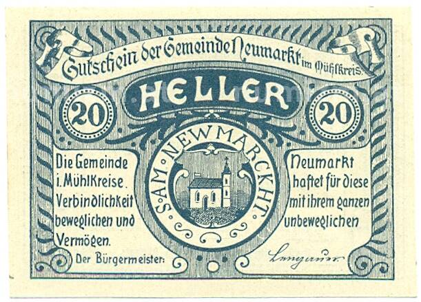 Купить 20 геллеров 1920 года Австрия — Ноймаркт-им-Мюлькрайс (Нотгельд) по привлекательной цене можно в нашем интернет-магазине — Вам достаточно оформить заказ на сайте. Все монеты, представленные в каталоге, находятся в наличии на нашем складе.
