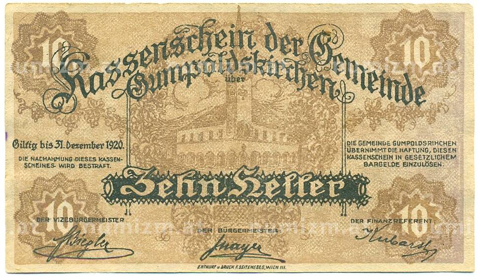 Банкнота 10 геллеров 1920 года Австрия — Гумпольдскирхен (Нотгельд) (Артикул: B2-16230): подробные характеристики, качественные фотографии в высоком разрешении, низкая цена.