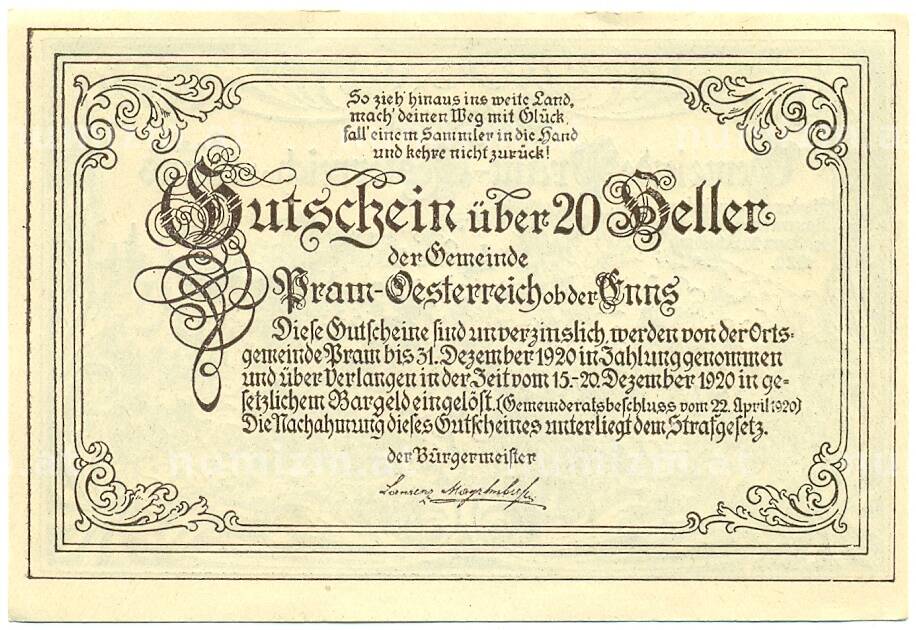 Купить 20 геллеров 1920 года Австрия — Прам (Нотгельд) по привлекательной цене можно в нашем интернет-магазине — Вам достаточно оформить заказ на сайте. Все монеты, представленные в каталоге, находятся в наличии на нашем складе.