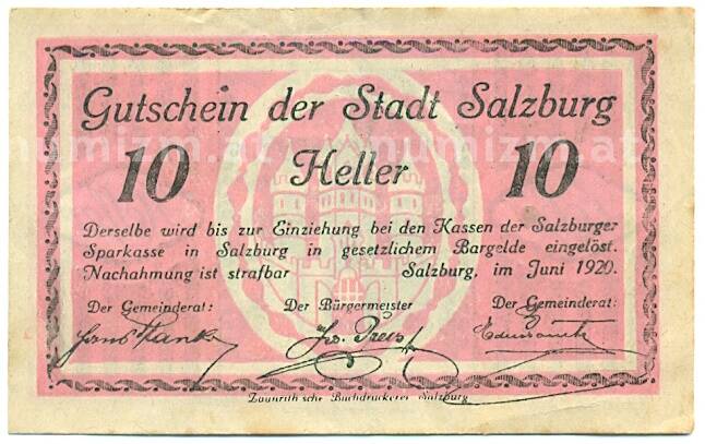 20.01.2025Интернет магазин «Нумизмат» предлагает приобрести 10 геллеров 1920 года Австрия — Зальцбург (Нотгельд).