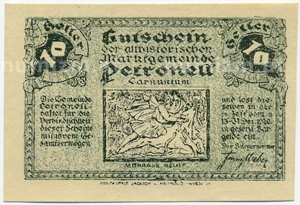Купить 10 геллеров 1920 года Австрия — Петронелль (Нотгельд) по привлекательной цене можно в нашем интернет-магазине — Вам достаточно оформить заказ на сайте. Все монеты, представленные в каталоге, находятся в наличии на нашем складе.