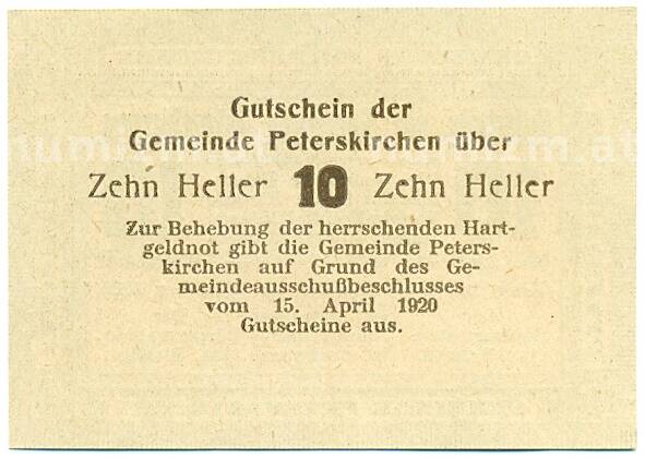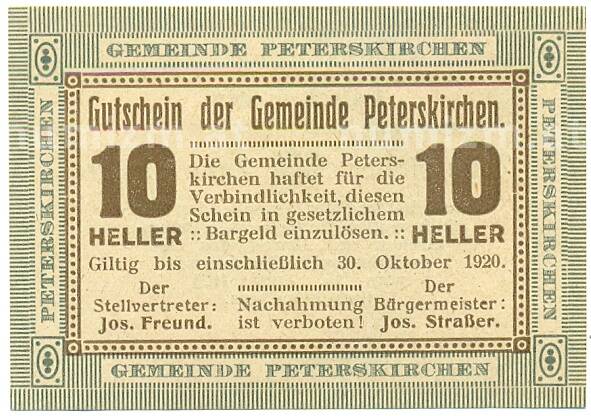 Купить 10 геллеров 1920 года Австрия — Петерскирхен (Нотгельд) по привлекательной цене можно в нашем интернет-магазине — Вам достаточно оформить заказ на сайте. Все монеты, представленные в каталоге, находятся в наличии на нашем складе.