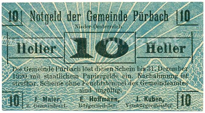 Банкнота 10 геллеров 1920 года Австрия — Пюрбах (Нотгельд) (Артикул: B2-16266): подробные характеристики, качественные фотографии в высоком разрешении, низкая цена.