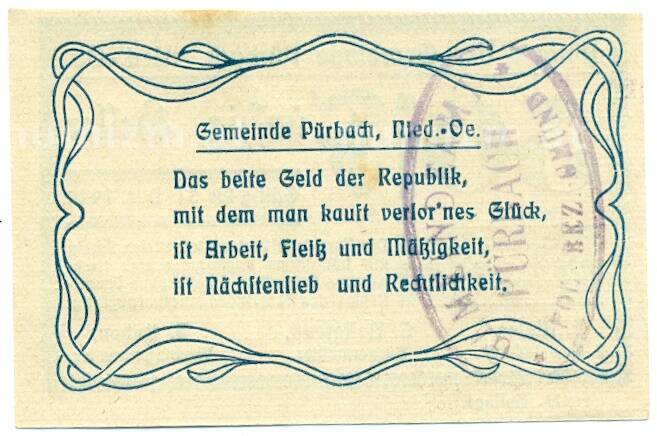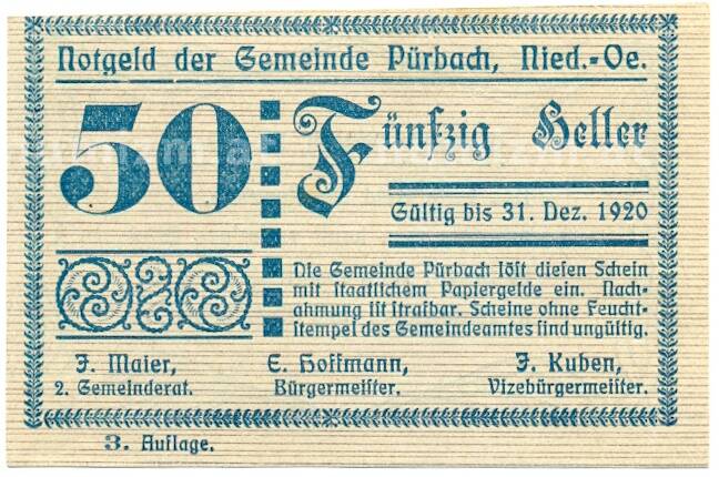 Купить 50 геллеров 1920 года Австрия — Пюрбах (Нотгельд) по привлекательной цене можно в нашем интернет-магазине — Вам достаточно оформить заказ на сайте. Все монеты, представленные в каталоге, находятся в наличии на нашем складе.