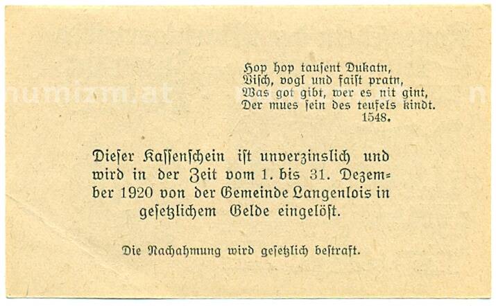 Купить 20 геллеров 1920 года Австрия — Лангенлойс (Нотгельд) по привлекательной цене можно в нашем интернет-магазине — Вам достаточно оформить заказ на сайте. Все монеты, представленные в каталоге, находятся в наличии на нашем складе.