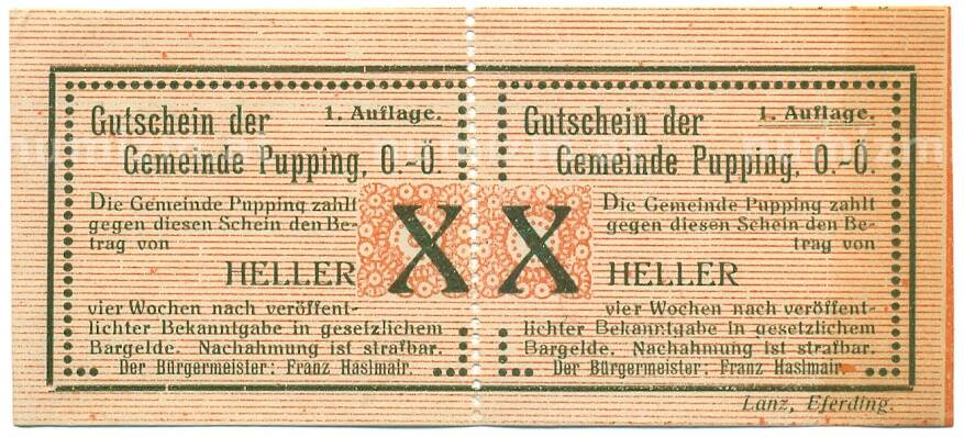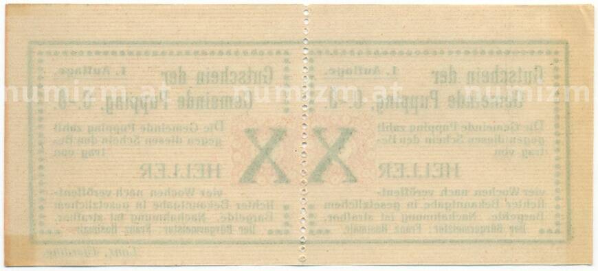 Банкнота 20 геллеров 1920 года Австрия — Пуппинг (Нотгельд) (Артикул: B2-16283): подробные характеристики, качественные фотографии в высоком разрешении, низкая цена.