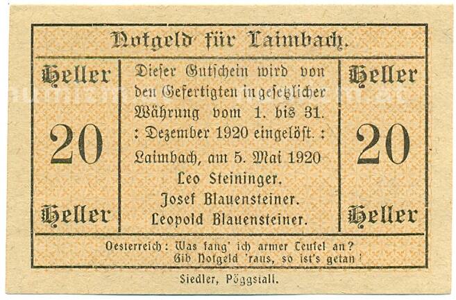 Купить 20 геллеров 1920 года Австрия — Ламбах (Нотгельд) по привлекательной цене можно в нашем интернет-магазине — Вам достаточно оформить заказ на сайте. Все монеты, представленные в каталоге, находятся в наличии на нашем складе.