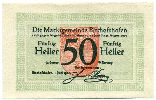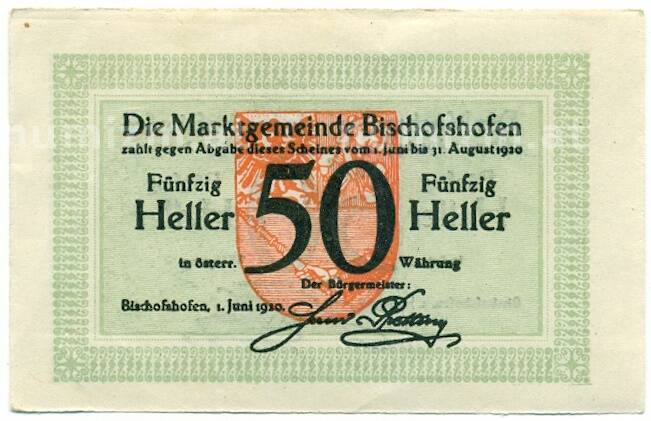 Купить 50 геллеров 1920 года Австрия — Бишофсхофен (Нотгельд) по привлекательной цене можно в нашем интернет-магазине — Вам достаточно оформить заказ на сайте. Все монеты, представленные в каталоге, находятся в наличии на нашем складе.