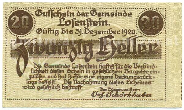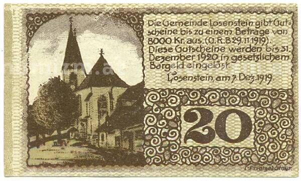 Купить 20 геллеров 1919 года Австрия — Лозенштайн (Нотгельд) по привлекательной цене можно в нашем интернет-магазине — Вам достаточно оформить заказ на сайте. Все монеты, представленные в каталоге, находятся в наличии на нашем складе.