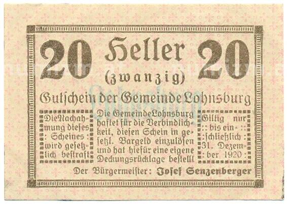 Банкнота 20 геллеров 1920 года Австрия — Лохнсбург (Нотгельд) (Артикул: B2-16379): подробные характеристики, качественные фотографии в высоком разрешении, низкая цена.