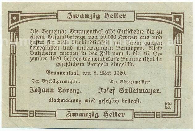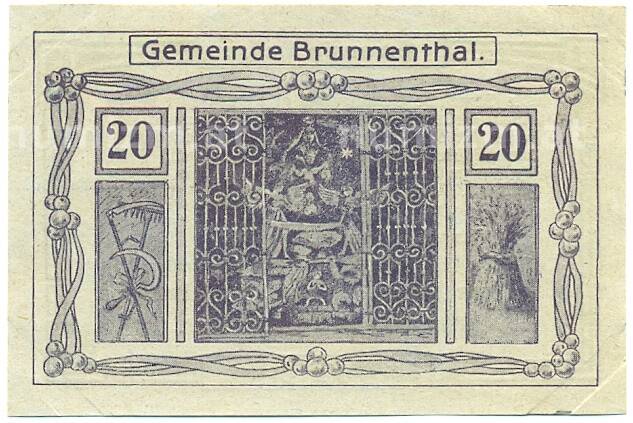 Купить 20 геллеров 1920 года Австрия — Брунненталь (Нотгельд) по привлекательной цене можно в нашем интернет-магазине — Вам достаточно оформить заказ на сайте. Все монеты, представленные в каталоге, находятся в наличии на нашем складе.