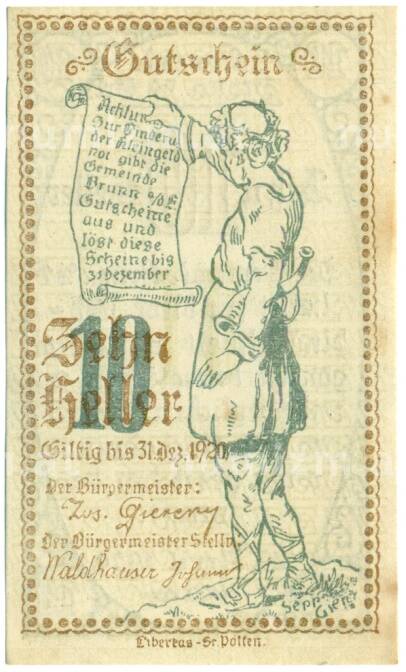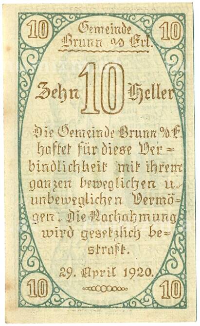 Купить 10 геллеров 1920 года Австрия — Брунн-ам-Эрль (Нотгельд) по привлекательной цене можно в нашем интернет-магазине — Вам достаточно оформить заказ на сайте. Все монеты, представленные в каталоге, находятся в наличии на нашем складе.