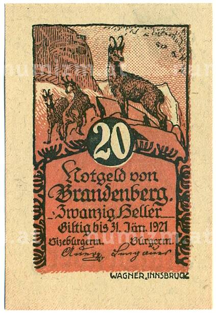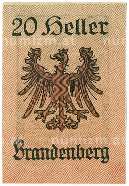 Купить 20 геллеров 1921 года Австрия — Бранденбург (Нотгельд) по привлекательной цене можно в нашем интернет-магазине — Вам достаточно оформить заказ на сайте. Все монеты, представленные в каталоге, находятся в наличии на нашем складе.