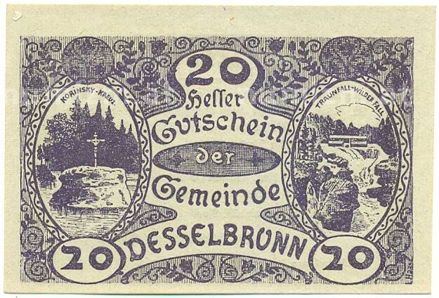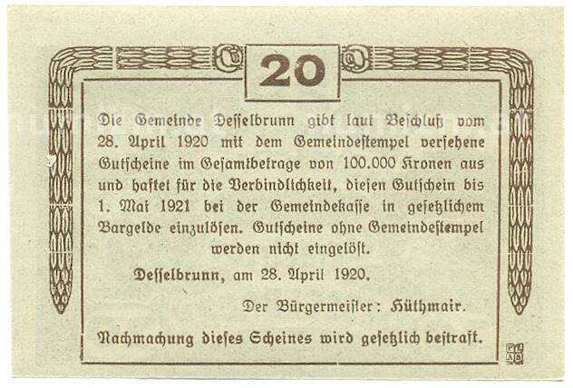 Купить 20 геллеров 1920 года Австрия — Дессельбрунн (Нотгельд) по привлекательной цене можно в нашем интернет-магазине — Вам достаточно оформить заказ на сайте. Все монеты, представленные в каталоге, находятся в наличии на нашем складе.