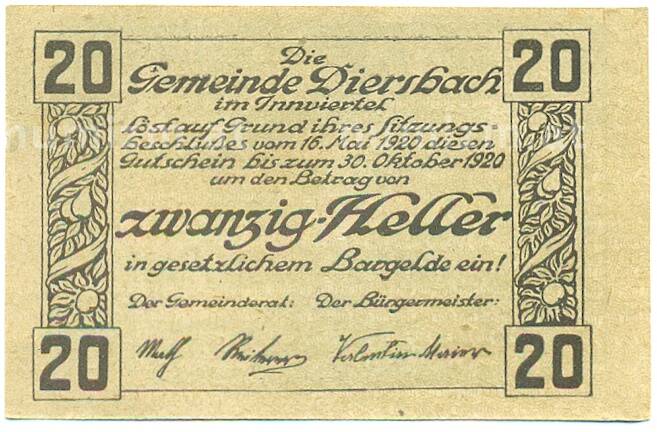 Купить 20 геллеров 1920 года Австрия — Дирсбах (Нотгельд) по привлекательной цене можно в нашем интернет-магазине — Вам достаточно оформить заказ на сайте. Все монеты, представленные в каталоге, находятся в наличии на нашем складе.