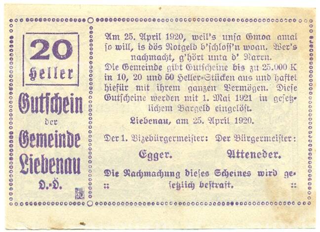 Купить 20 геллеров 1920 года Австрия — Либенау (Нотгельд) по привлекательной цене можно в нашем интернет-магазине — Вам достаточно оформить заказ на сайте. Все монеты, представленные в каталоге, находятся в наличии на нашем складе.