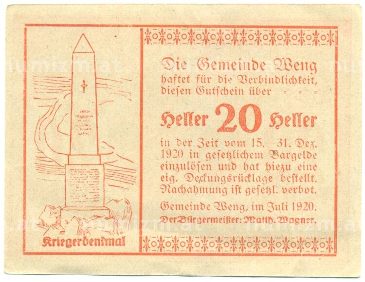 Купить 20 геллеров 1920 года Австрия — Венг (Нотгельд) по привлекательной цене можно в нашем интернет-магазине — Вам достаточно оформить заказ на сайте. Все монеты, представленные в каталоге, находятся в наличии на нашем складе.