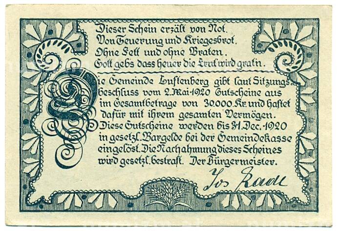 Банкнота 50 геллеров 1920 года Австрия — Луфтенберг (Нотгельд) (Артикул: B2-16511): подробные характеристики, качественные фотографии в высоком разрешении, низкая цена.