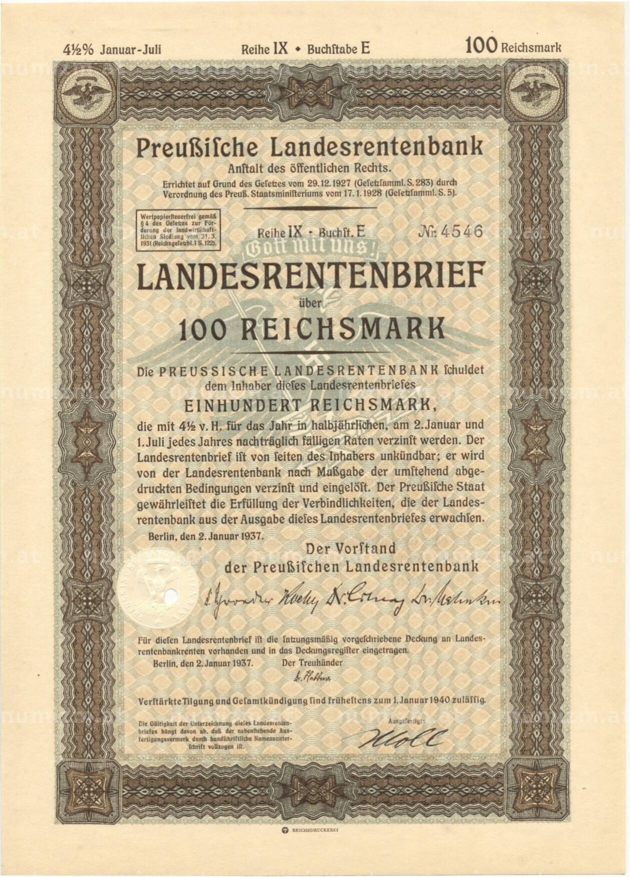 Купить Акция (облигация) 100 рейхсмарок 1937 года Германия по привлекательной цене можно в нашем интернет-магазине — Вам достаточно оформить заказ на сайте. Все монеты, представленные в каталоге, находятся в наличии на нашем складе.