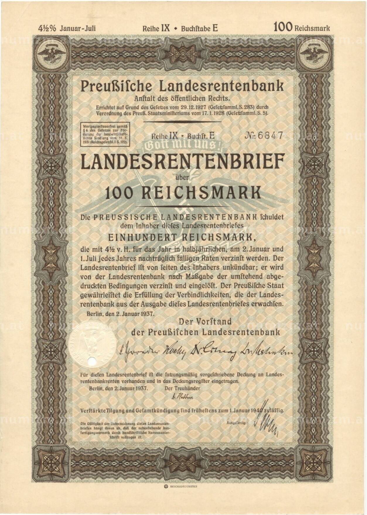 Акция (облигация) 100 рейхсмарок 1937 года Германия (Артикул: B2-6411): подробные характеристики, качественные фотографии в высоком разрешении, низкая цена.
