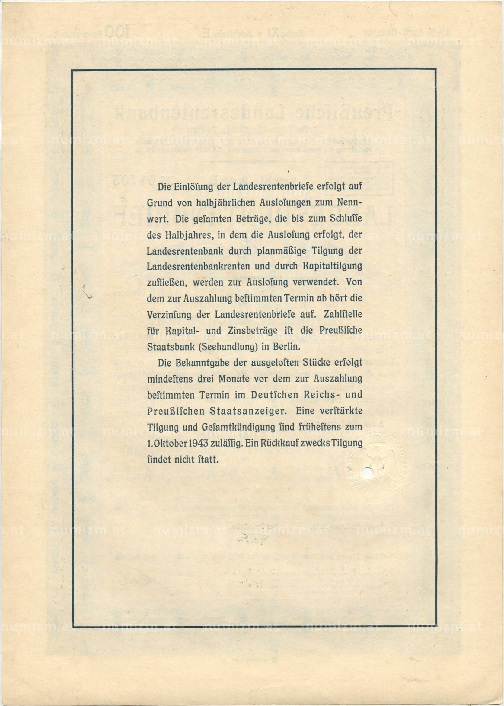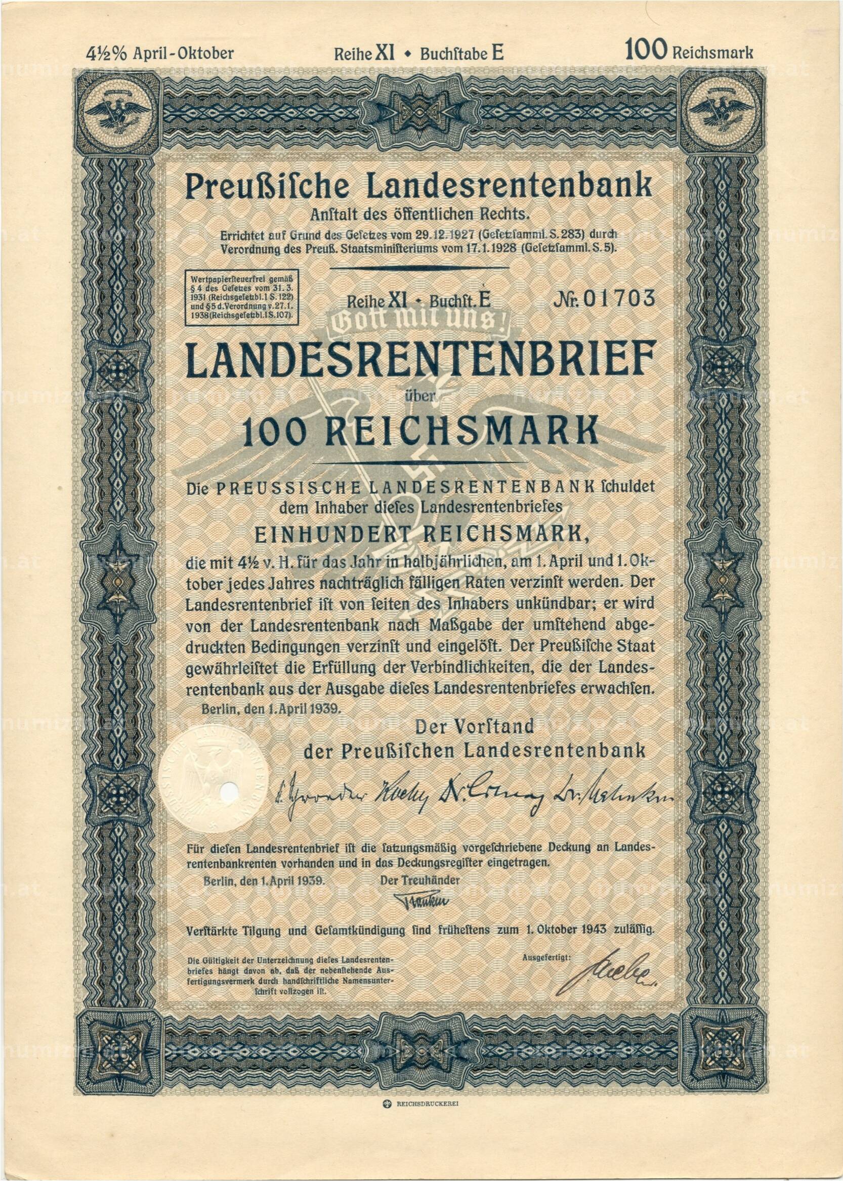 4 1/2% акция (облигация) 100 рейхсмарок 1939 года Германия (Артикул: B2-8621): подробные характеристики, качественные фотографии в высоком разрешении, низкая цена.