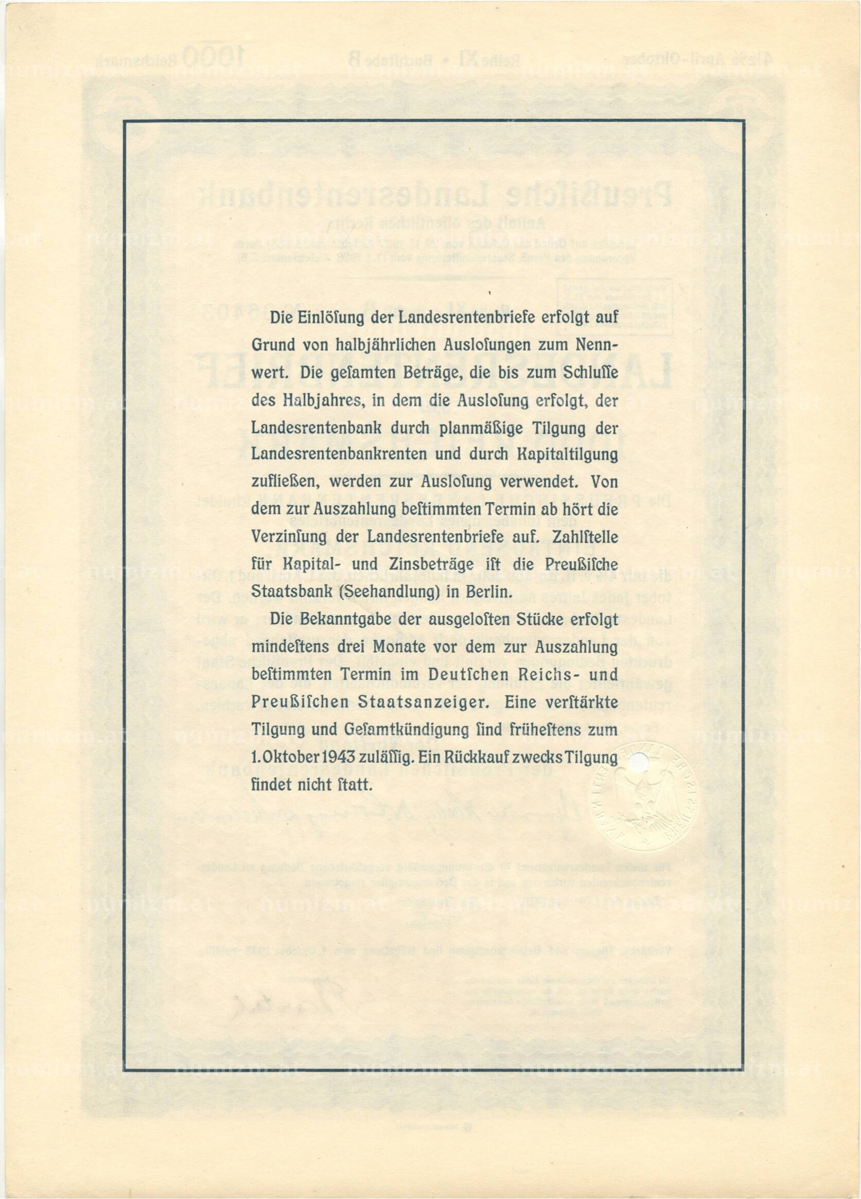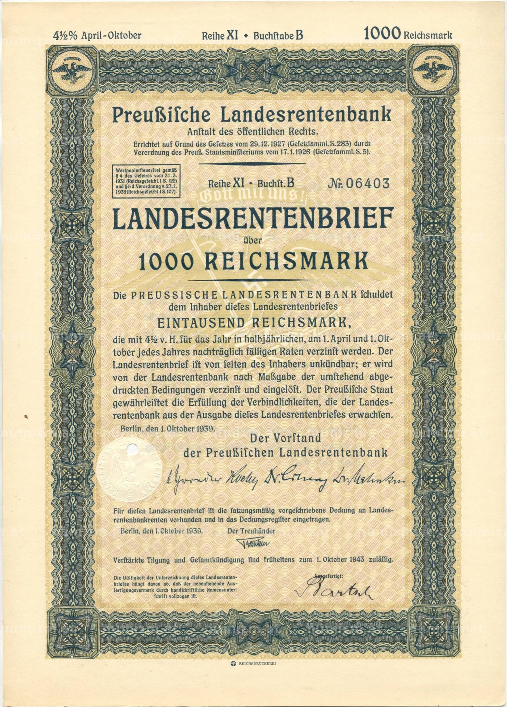 4 1/2% акция (облигация) 1000 рейхсмарок 1939 года Германия (Артикул: B2-8638): подробные характеристики, качественные фотографии в высоком разрешении, низкая цена.