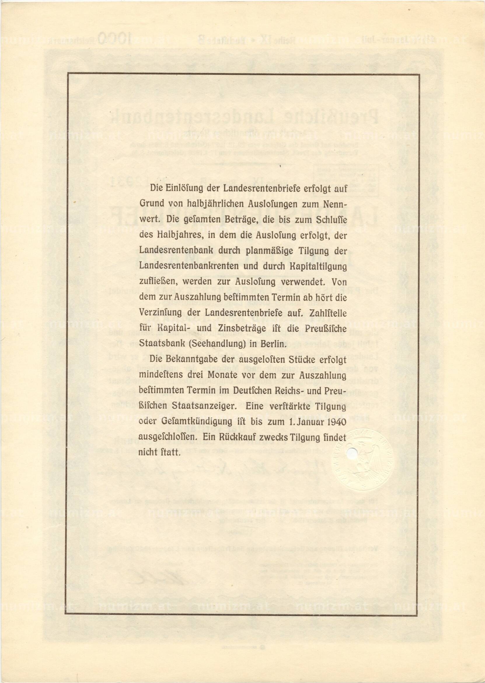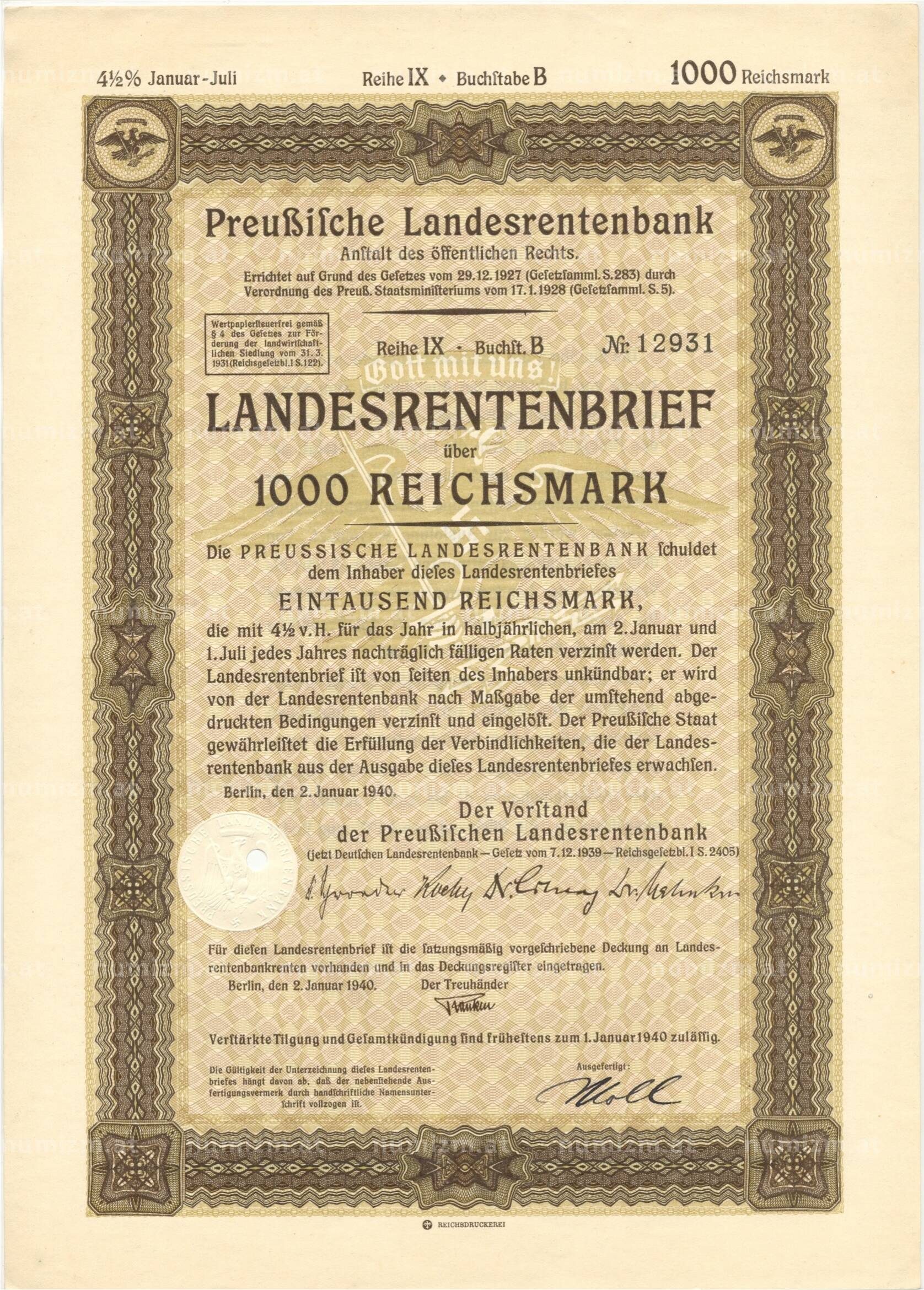 4 1/2% акция (облигация) 1000 рейхсмарок 1940 года Германия (Артикул: B2-8653): подробные характеристики, качественные фотографии в высоком разрешении, низкая цена.