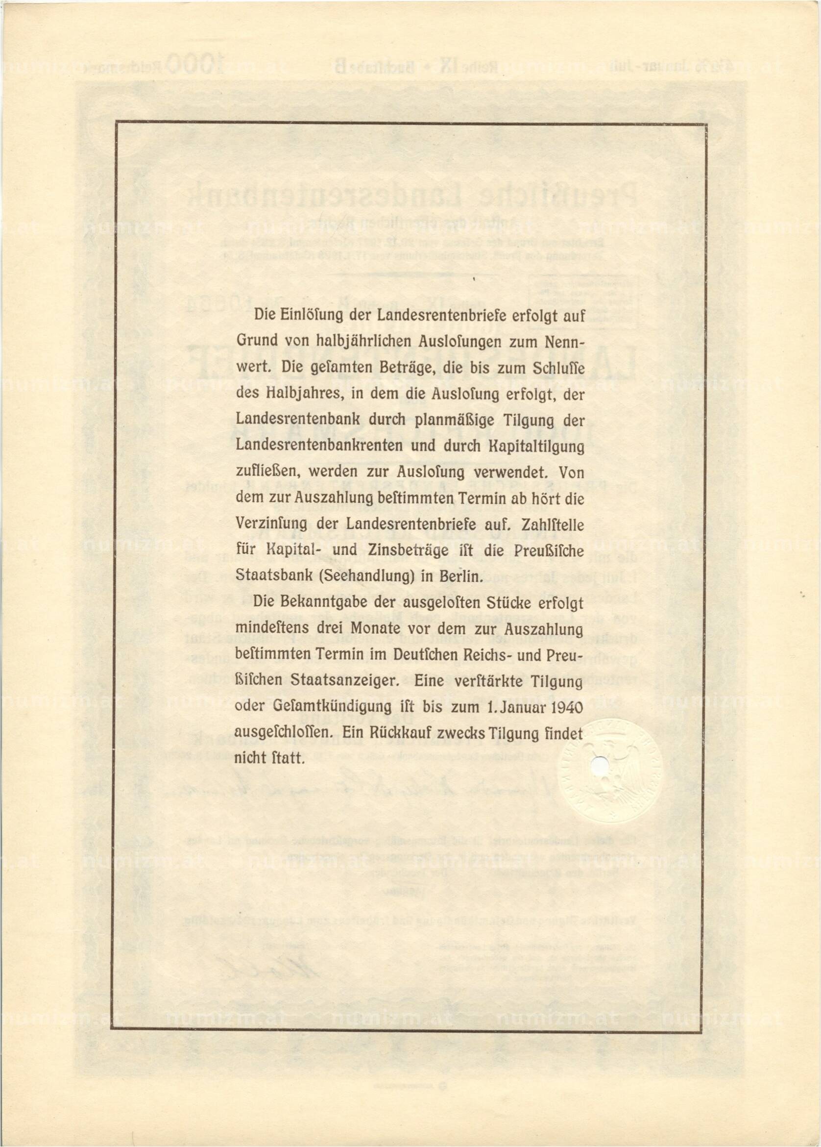 4 1/2% акция (облигация) 1000 рейхсмарок 1940 года Германия (Артикул: B2-8655): подробные характеристики, качественные фотографии в высоком разрешении, низкая цена.