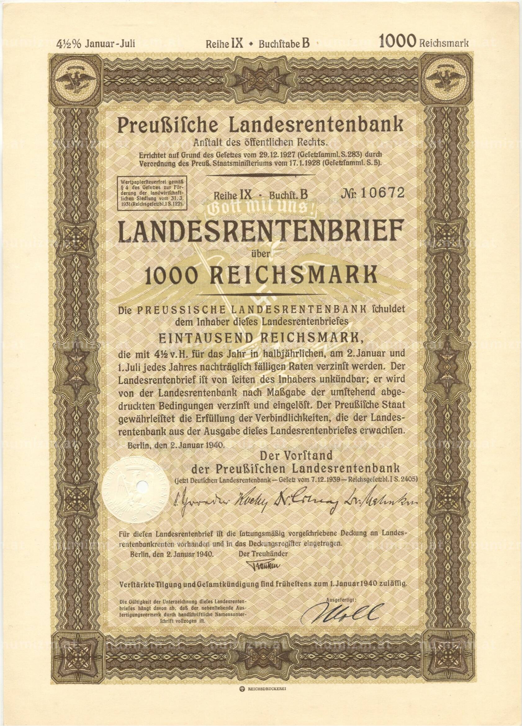 Купить 4 1/2% акция (облигация) 1000 рейхсмарок 1940 года Германия по привлекательной цене можно в нашем интернет-магазине — Вам достаточно оформить заказ на сайте. Все монеты, представленные в каталоге, находятся в наличии на нашем складе.