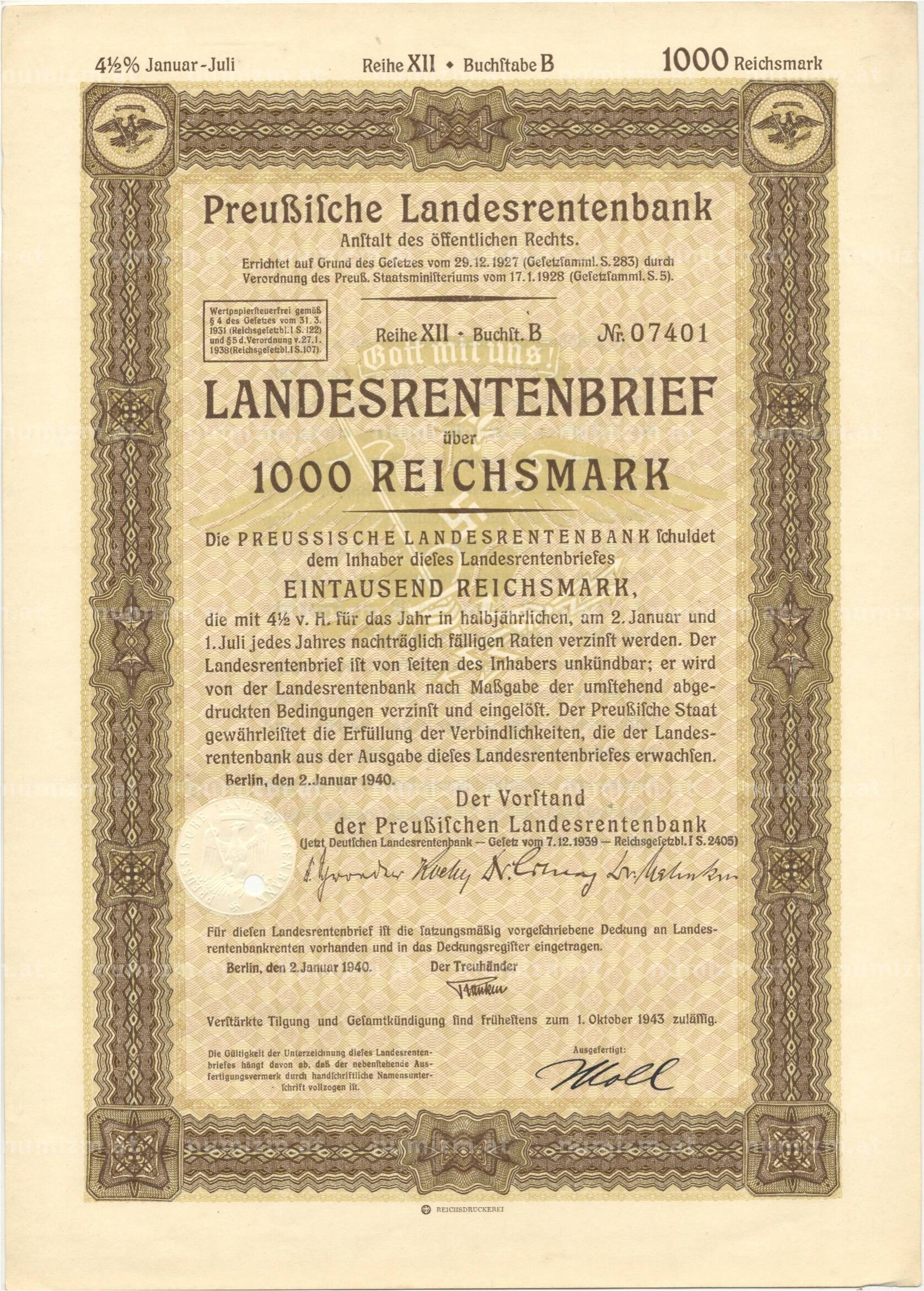 4 1/2% акция (облигация) 1000 рейхсмарок 1940 года Германия (Артикул: B2-8662): подробные характеристики, качественные фотографии в высоком разрешении, низкая цена.