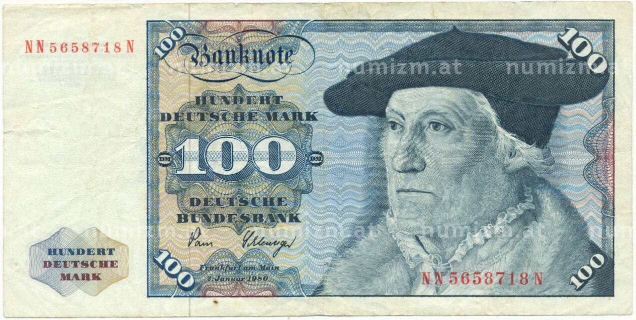 20.01.2025Интернет магазин «Нумизмат» предлагает приобрести 100 марок 1980 года Западная Германия (ФРГ).