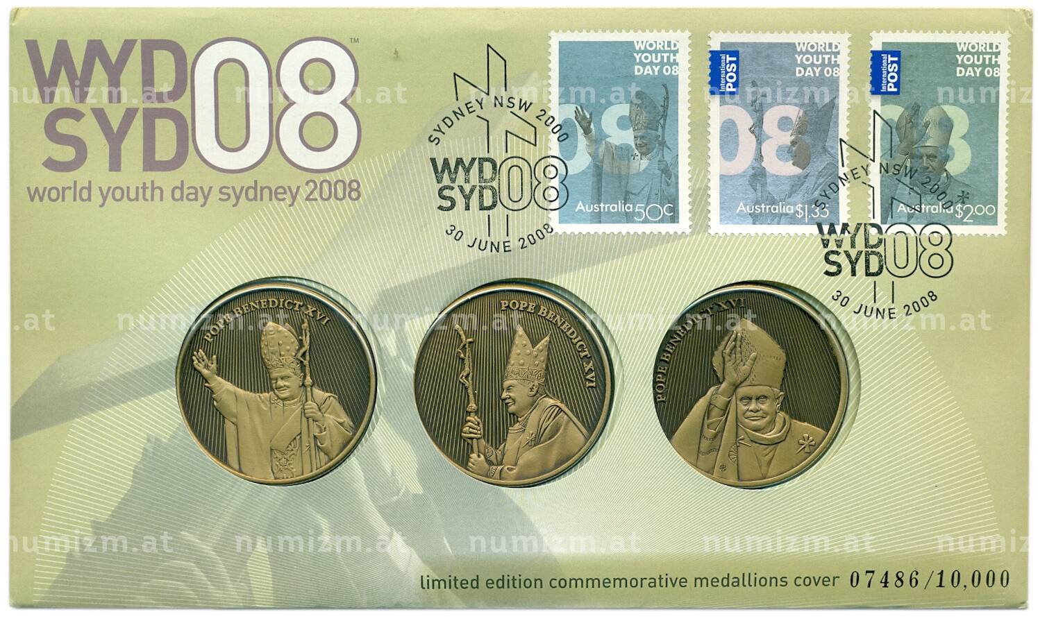 Купить Набор из 3 памятных медалей 2008 года Австралия «Всемирный день молодежи — Бенедикт XVI» (в конверте с марками) по привлекательной цене можно в нашем интернет-магазине — Вам достаточно оформить заказ на сайте. Все монеты, представленные в каталоге, находятся в наличии на нашем складе.