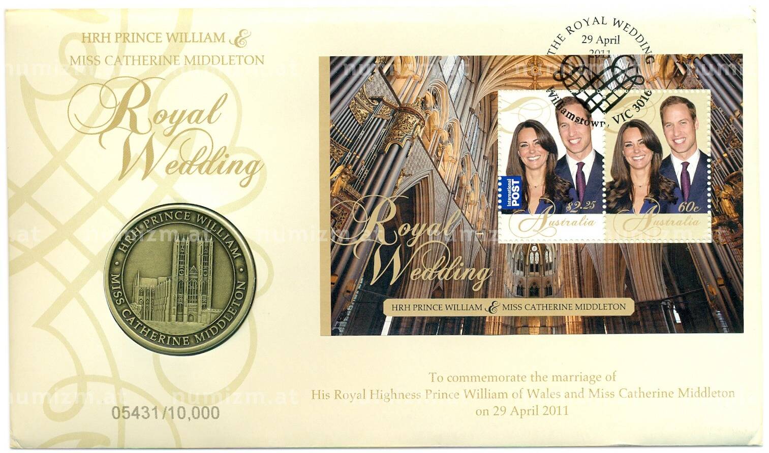 Купить Памятная медаль 2011 года Австралия «Свадьба принца Уильяма и Кэтрин Миддлтон» (в конверте с марками) по привлекательной цене можно в нашем интернет-магазине — Вам достаточно оформить заказ на сайте. Все монеты, представленные в каталоге, находятся в наличии на нашем складе.