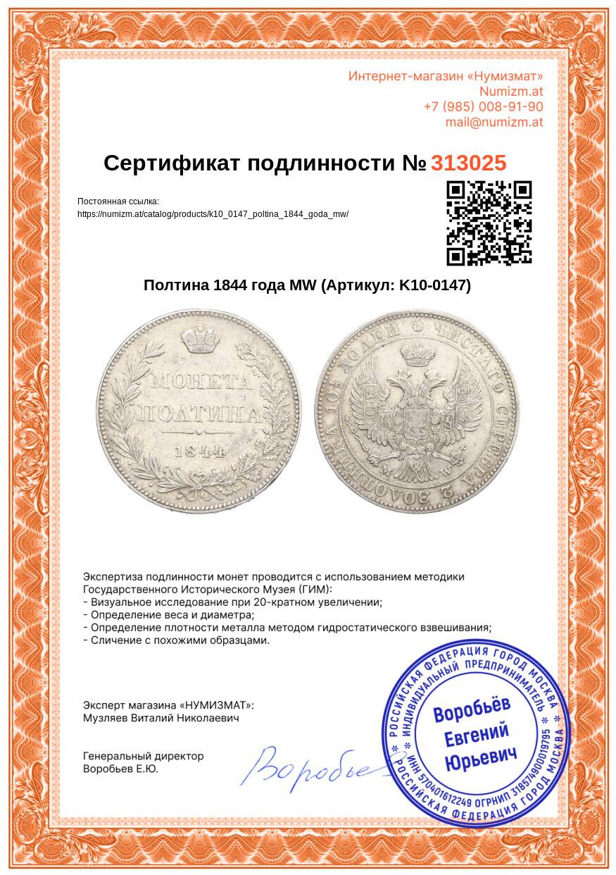 Купить Полтина 1844 года MW по привлекательной цене можно в нашем интернет-магазине — Вам достаточно оформить заказ на сайте. Все монеты, представленные в каталоге, находятся в наличии на нашем складе.
