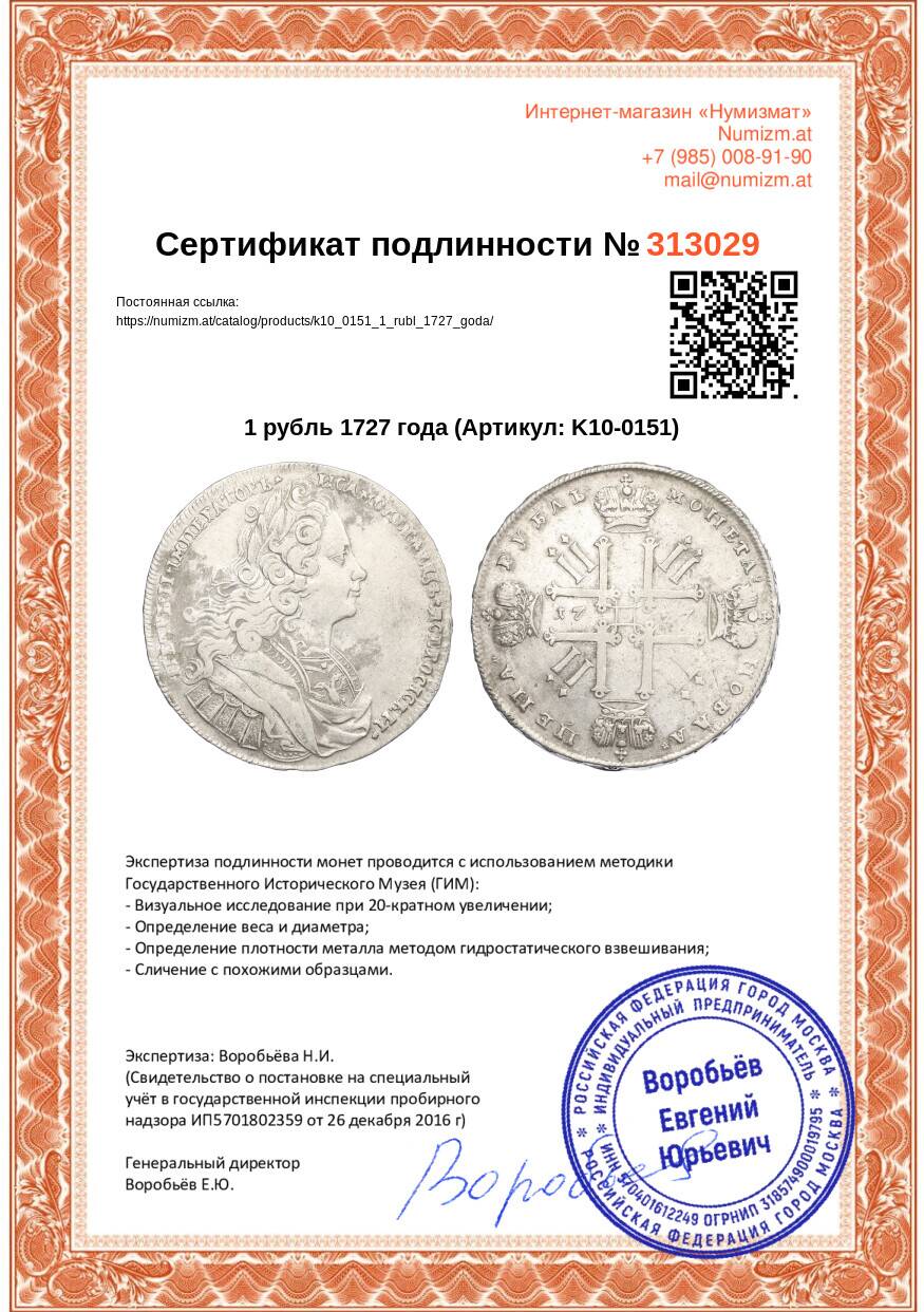 Купить 1 рубль 1727 года по привлекательной цене можно в нашем интернет-магазине — Вам достаточно оформить заказ на сайте. Все монеты, представленные в каталоге, находятся в наличии на нашем складе.