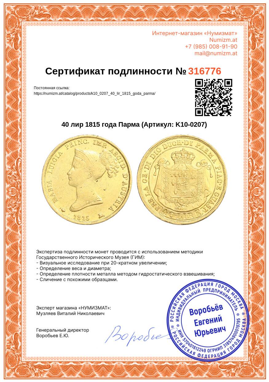 Купить 40 лир 1815 года Парма по привлекательной цене можно в нашем интернет-магазине — Вам достаточно оформить заказ на сайте. Все монеты, представленные в каталоге, находятся в наличии на нашем складе.